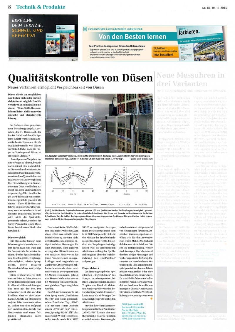 The coating industry magazine “besserlackieren” from Germany, reports in the issue 18_2015 about a new method to monitor the quality of nozzles or lacquer. The method was developed by Technical University of Darmstadt, the company LacTec and AOM-Systems. Here is the report (German language only).