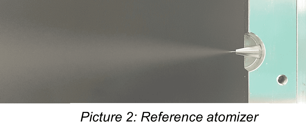 As a study for the droplets below 20µm ThermoFisher using a pneumatic atomizer (picture 2) for a reference. This atomizer is known for a fine atomization. The Table 2 shows the drop size distribution of this atomizer. The distribution shows a smooth bimodal curve starting at 1µm and with the peak at 15,5 µm, which fits the expectations well.