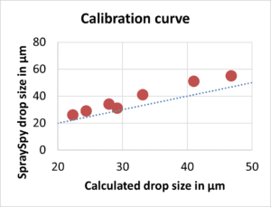 The author knows that this method is not perfect but a reliable and practical way of analysis the accuracy of the SpraySpy device. The picture 1 shows the set-up of the SpraySpy and the drop generator. Table 1 shows calibration curve of the study from ThermoFisher. In the calibration curve the blue dots are the theoretical droplet size given by the droplet generator (accuracy +/- 1%) and the red dots are the SpraySpy measurement result.