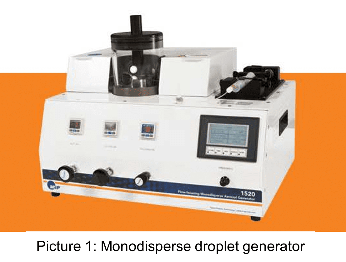 ThermoFisher used a TSI /MSP (Monodisperes aerosol generator Model 1520) drop generator. Based on the flow rate µl/min and the frequency it is possible to calculate the expected droplet size, starting at 20 µm. Comparing the theoretical drop size with the SpraySpy measurement result gives the SpraySpy accuracy.